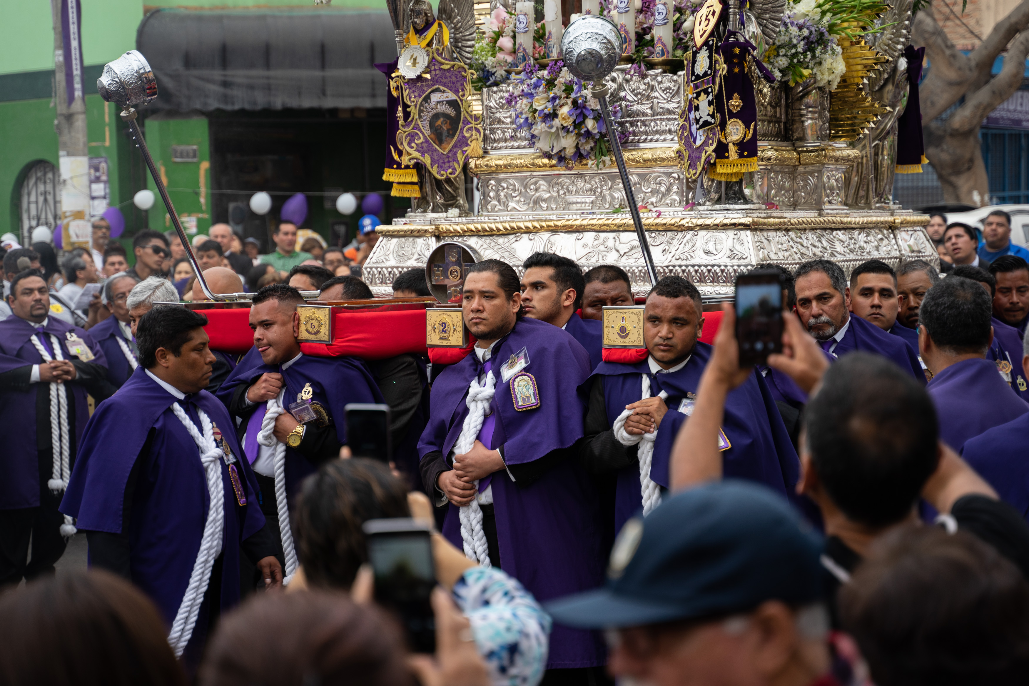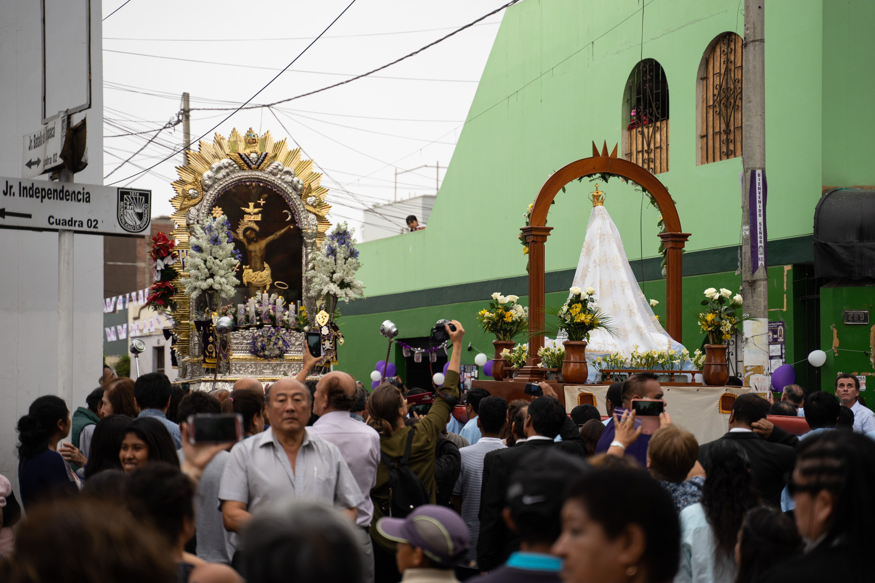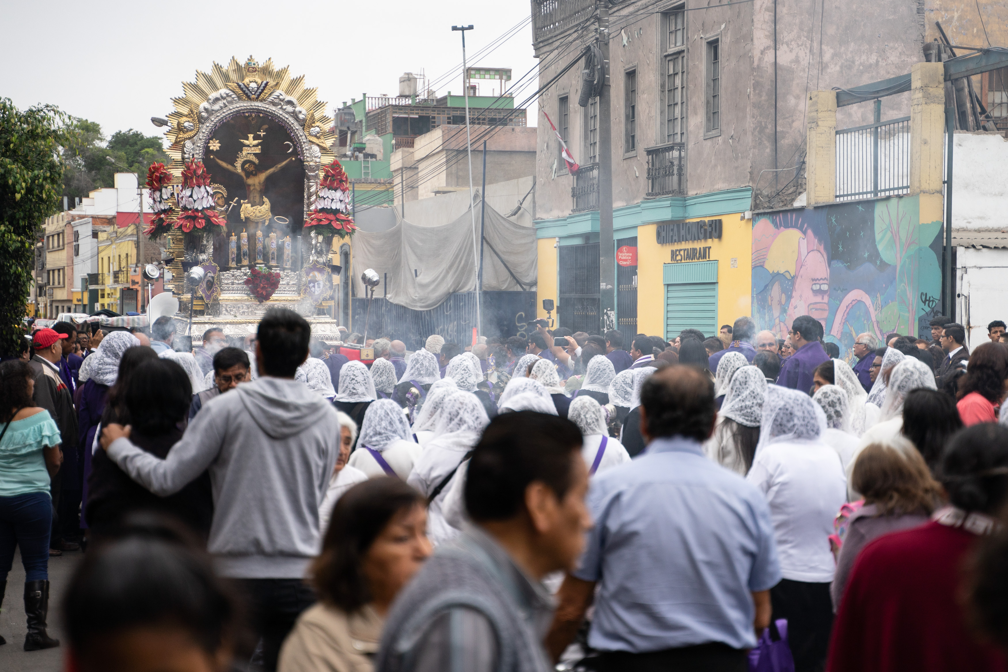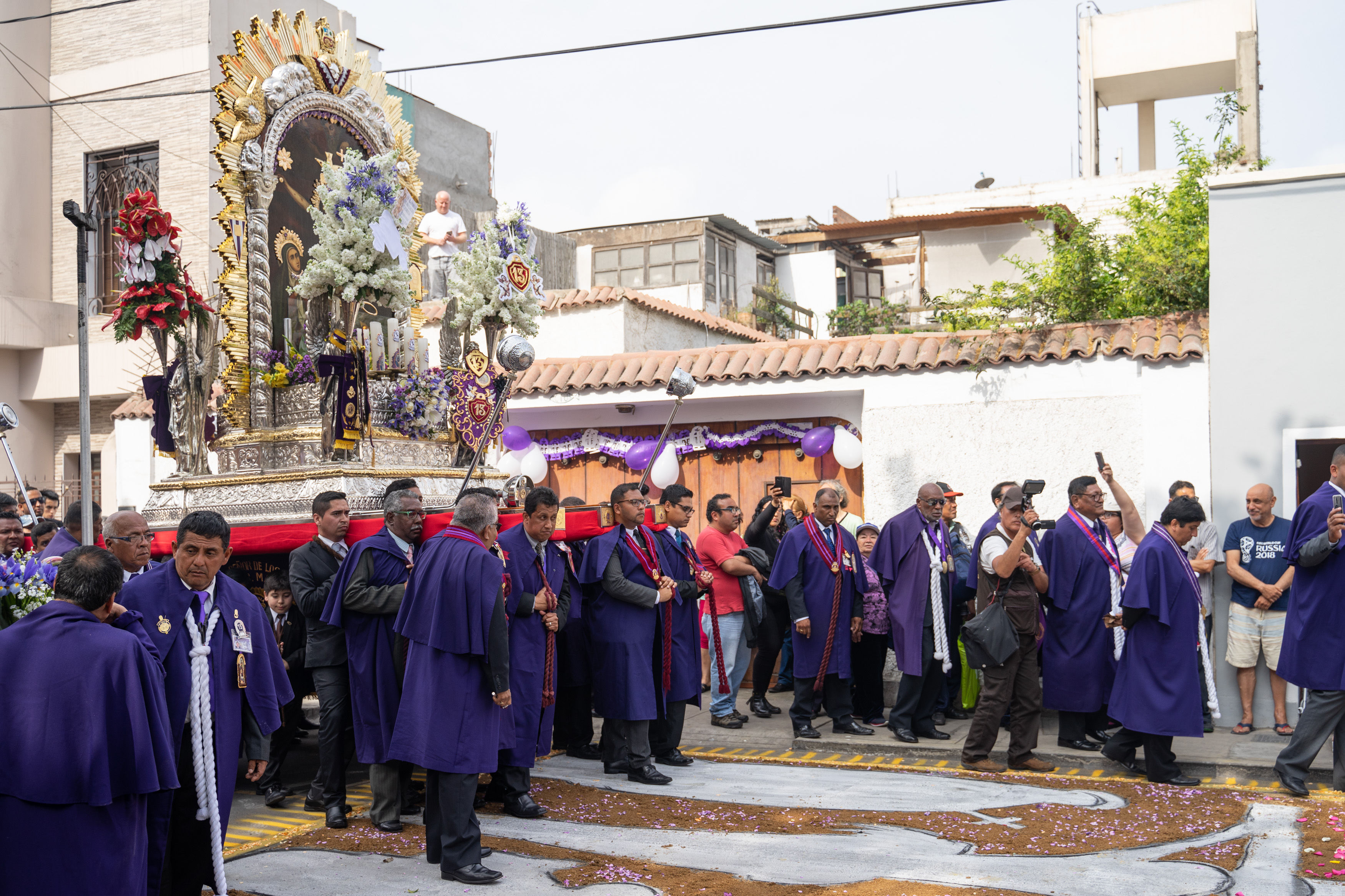 Zufällig haben wir dem Fest Señor de los Milagros beigewohnt – wir sahen auf einem Poster, dass die Prozession durch unsere Straße verläuft. Es wird ein Bildnis Jesu aus dem 17. Jahrhundert an mehreren Tagen auf verschiedenen Routen durch Lima getragen, die am 1. November ist die letzte von vielen. Wir hatten gesehen, dass es um acht los geht, und machten uns Sorgen, dass wir verpassen, wie sie bei uns vorbeikommen. Also waren wir um 8.30 da. Letztendlich war die Kolonne gegen 15 Uhr bei uns.