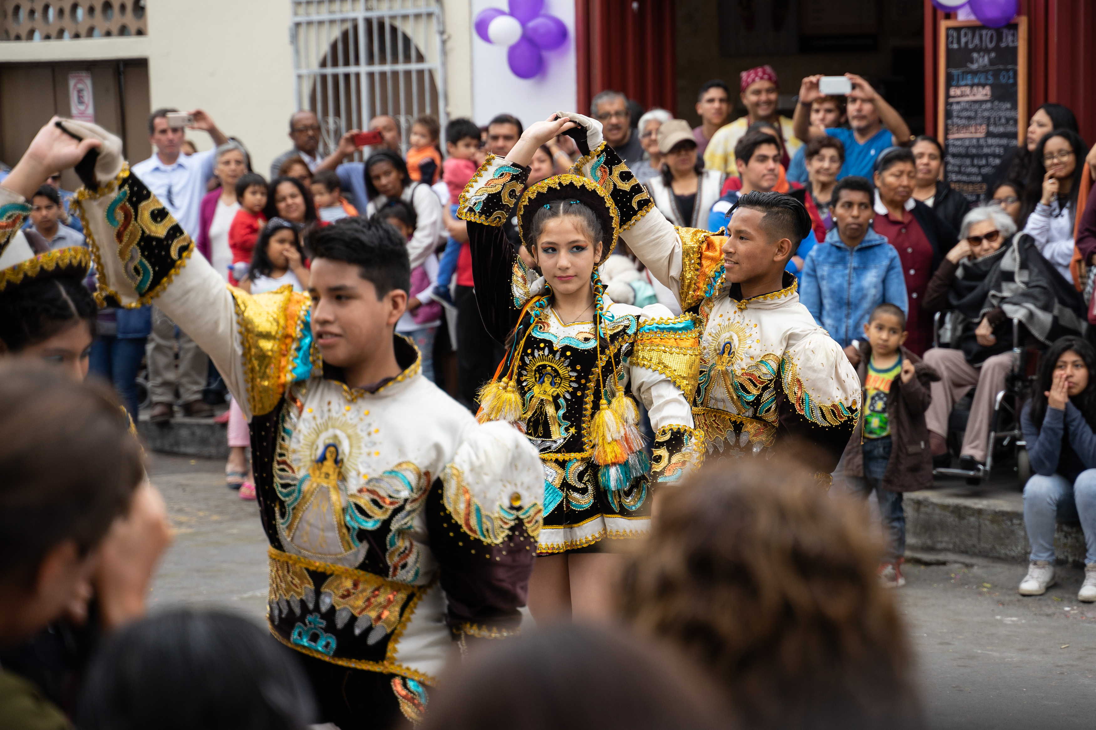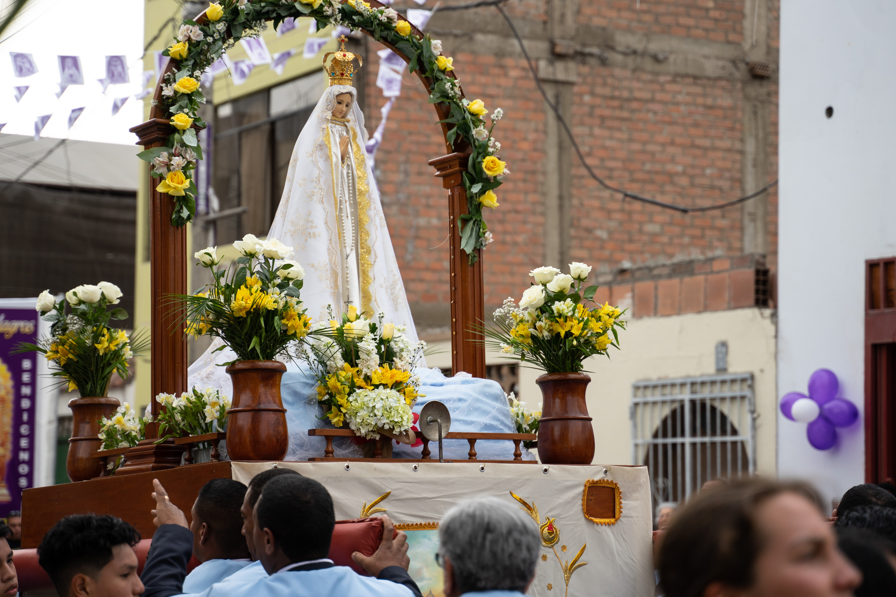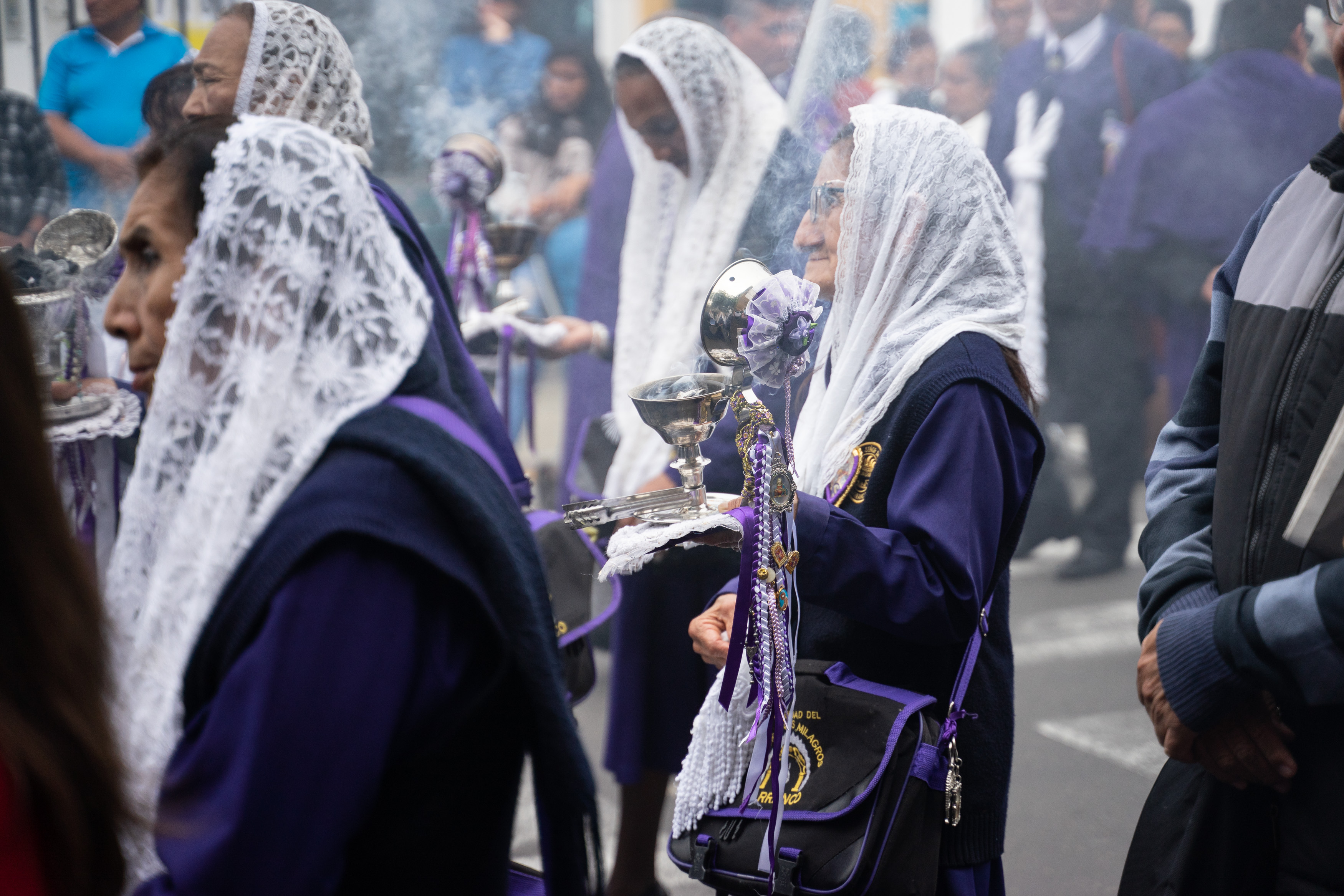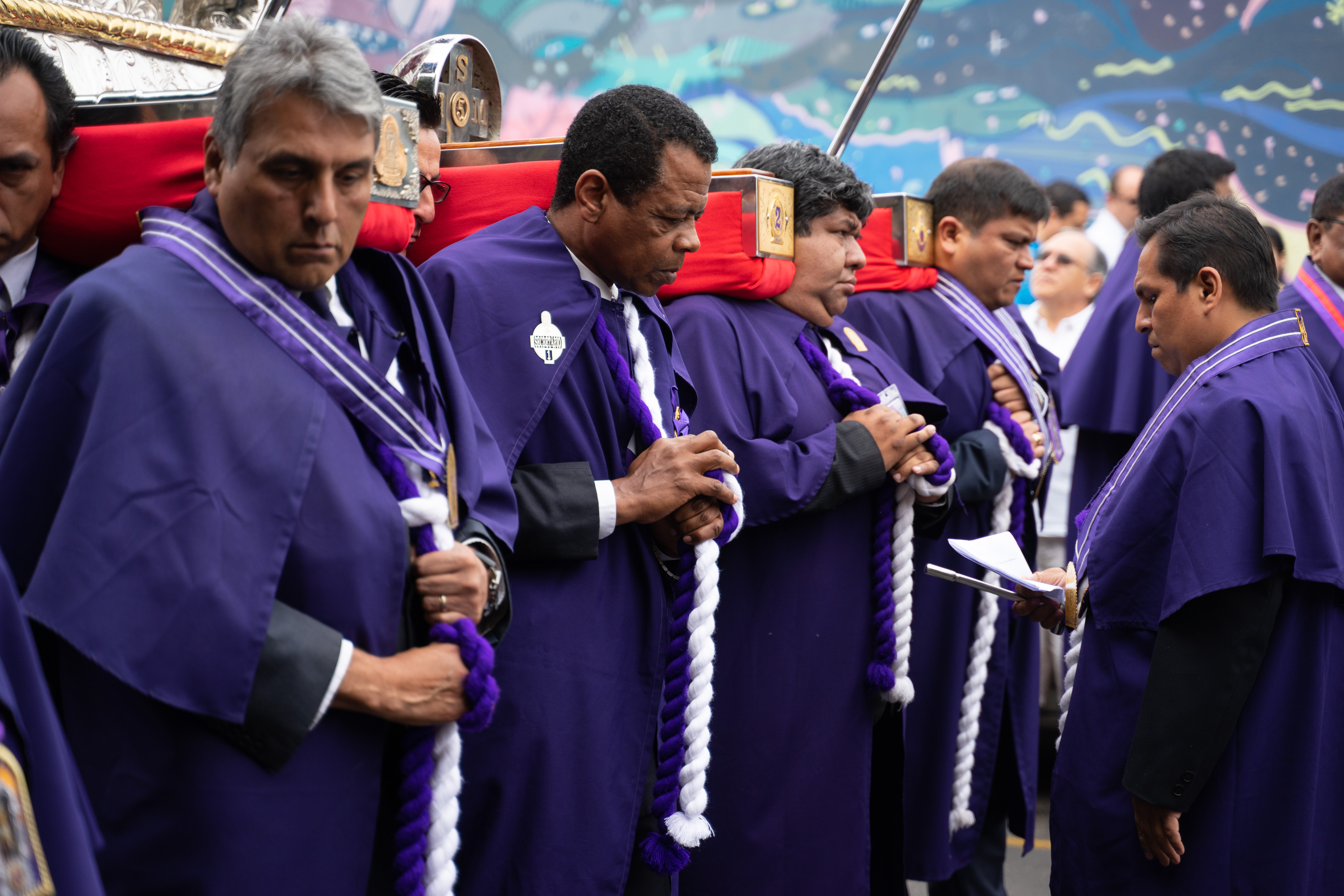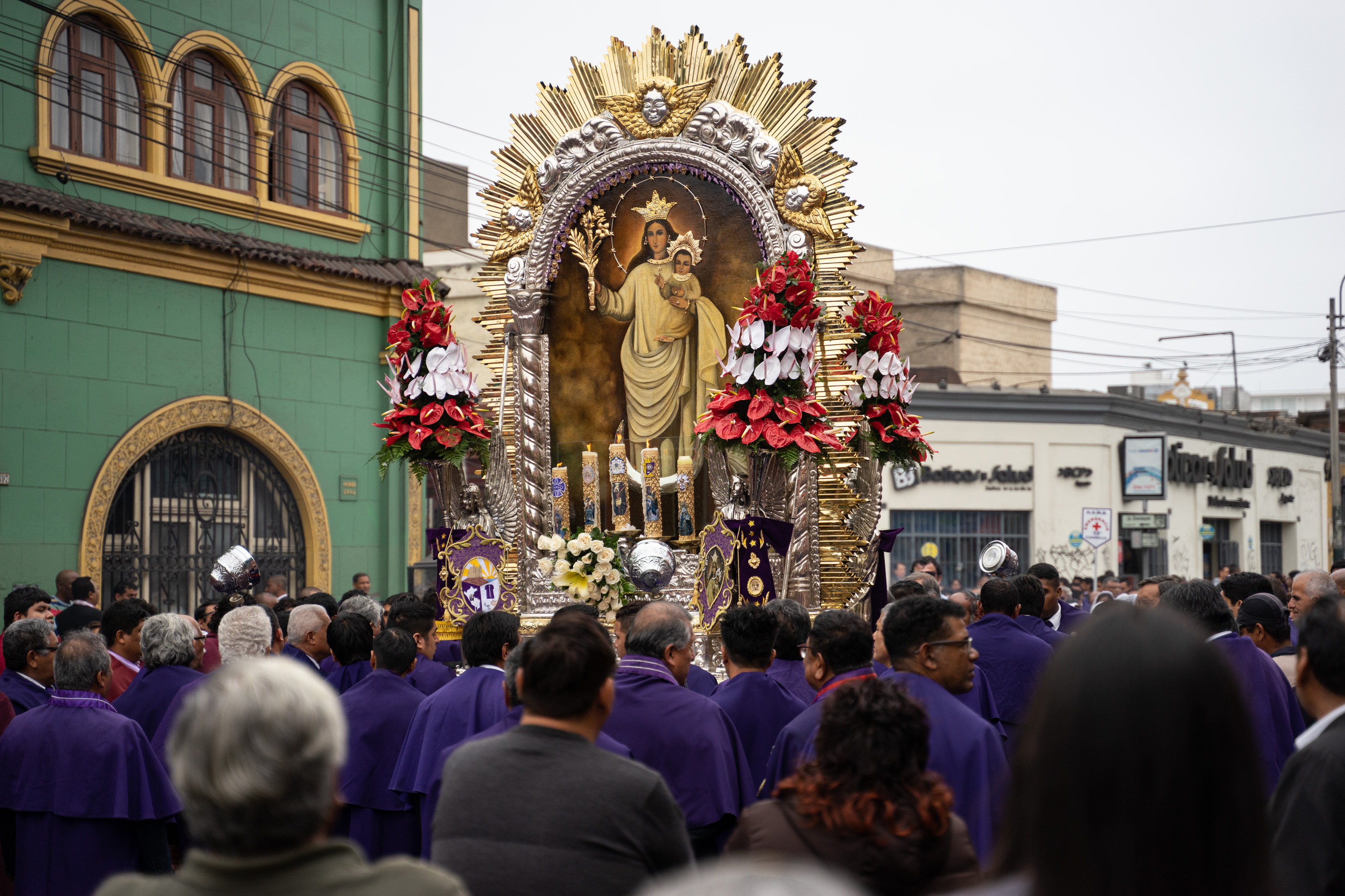 Zufällig haben wir dem Fest Señor de los Milagros beigewohnt – wir sahen auf einem Poster, dass die Prozession durch unsere Straße verläuft. Es wird ein Bildnis Jesu aus dem 17. Jahrhundert an mehreren Tagen auf verschiedenen Routen durch Lima getragen, die am 1. November ist die letzte von vielen. Wir hatten gesehen, dass es um acht los geht, und machten uns Sorgen, dass wir verpassen, wie sie bei uns vorbeikommen. Also waren wir um 8.30 da. Letztendlich war die Kolonne gegen 15 Uhr bei uns.