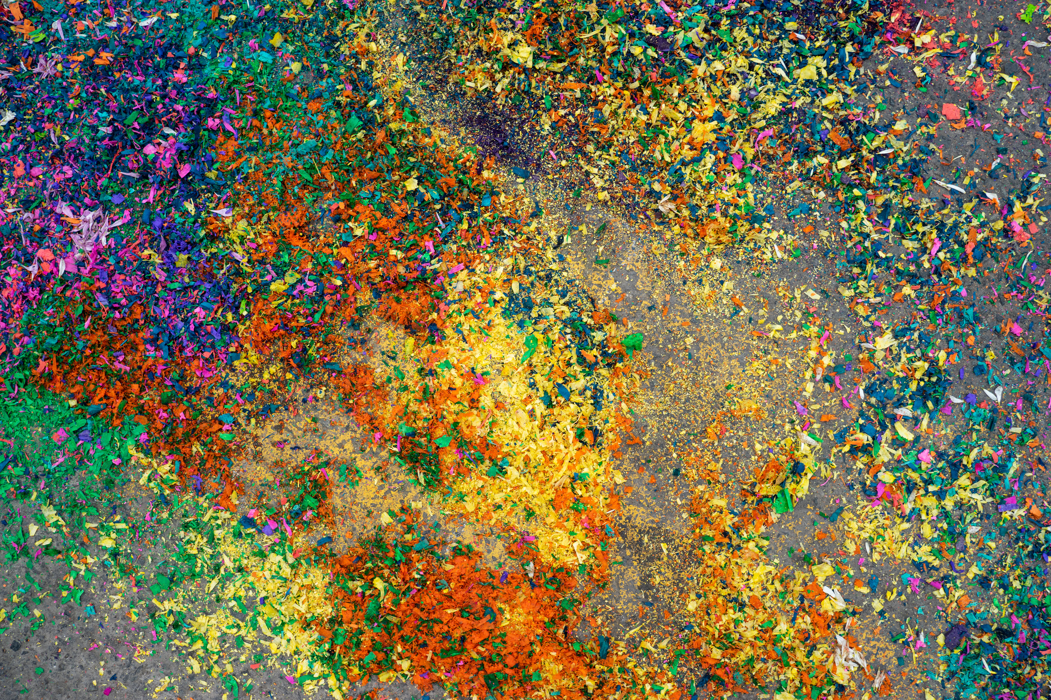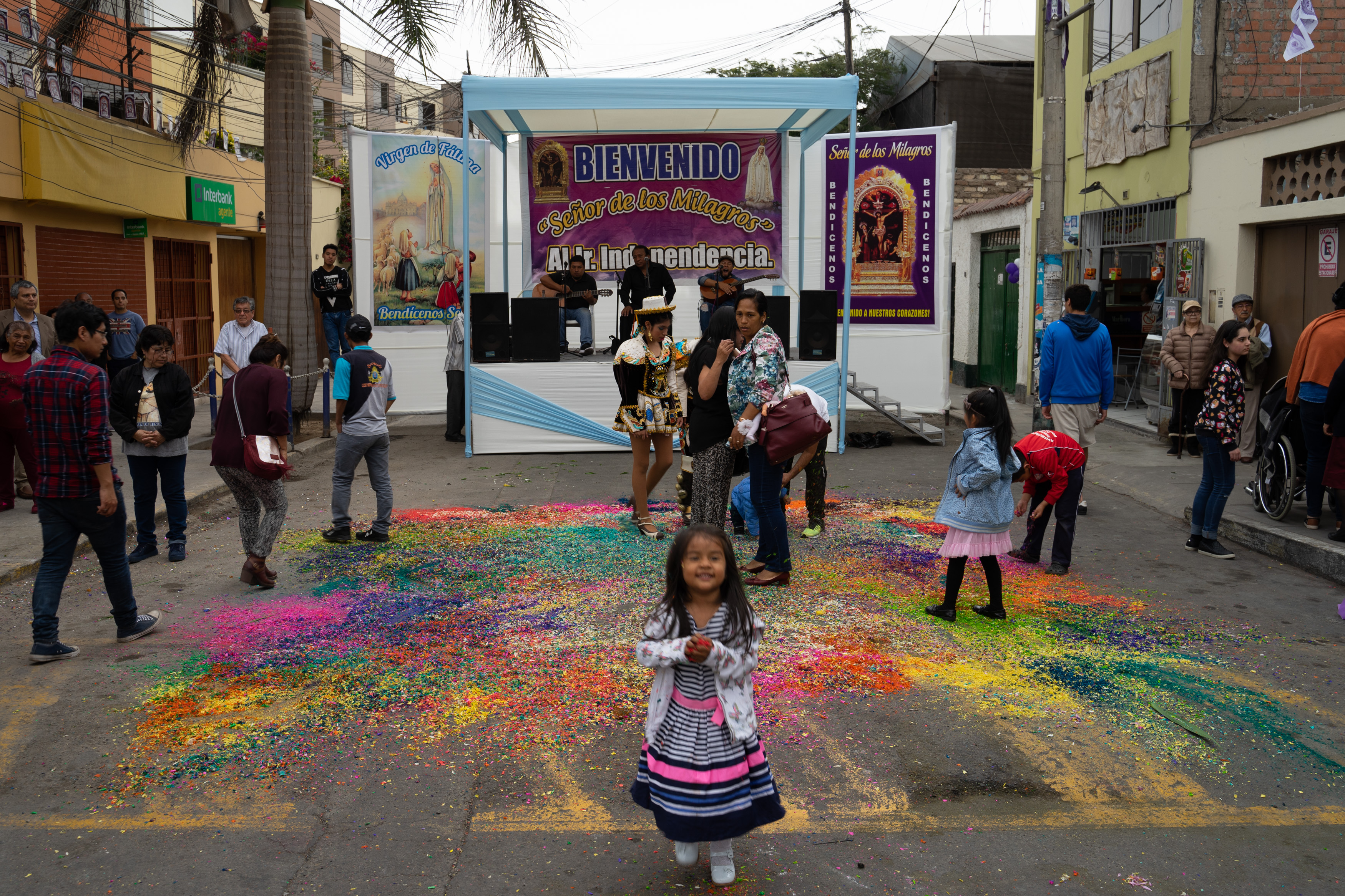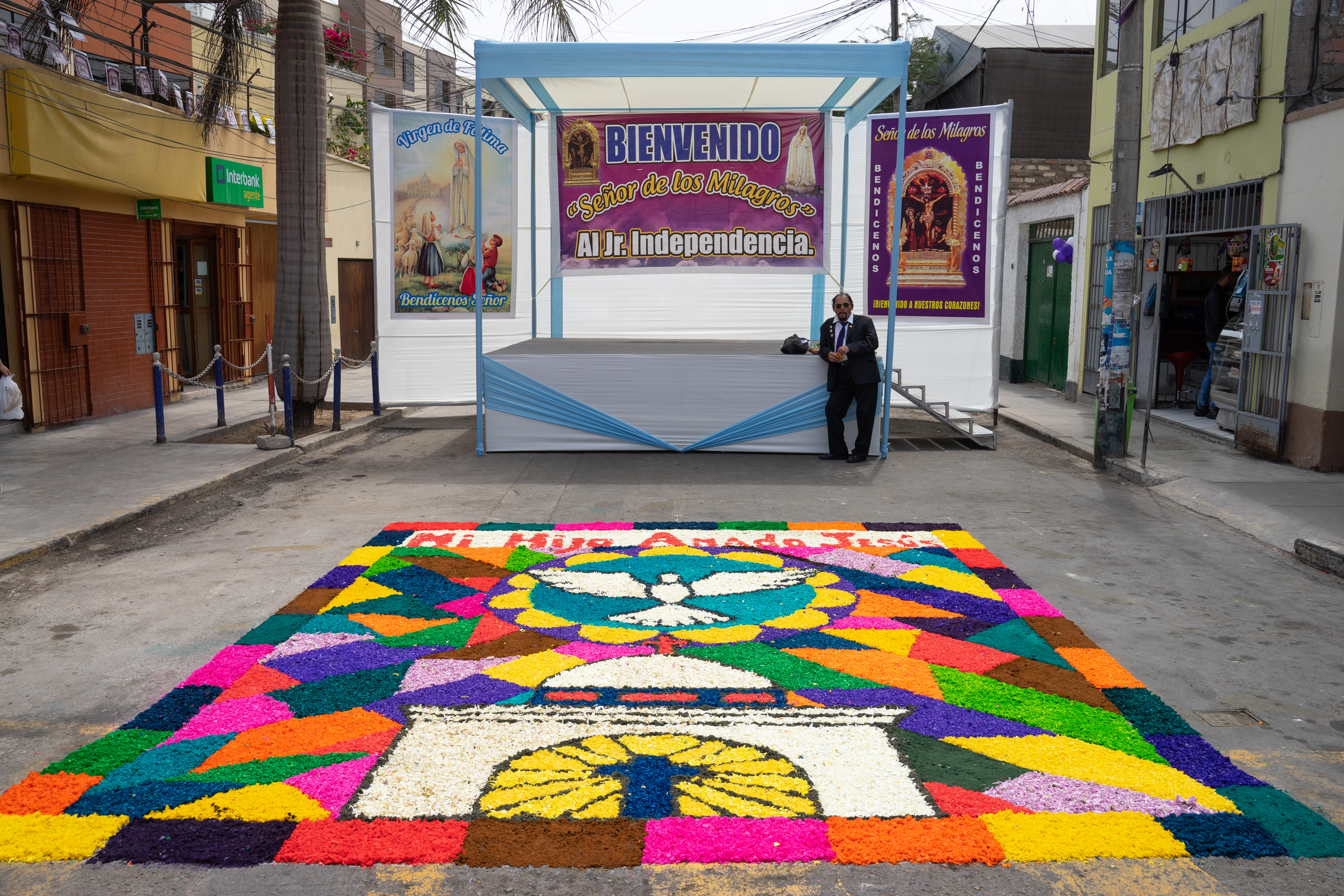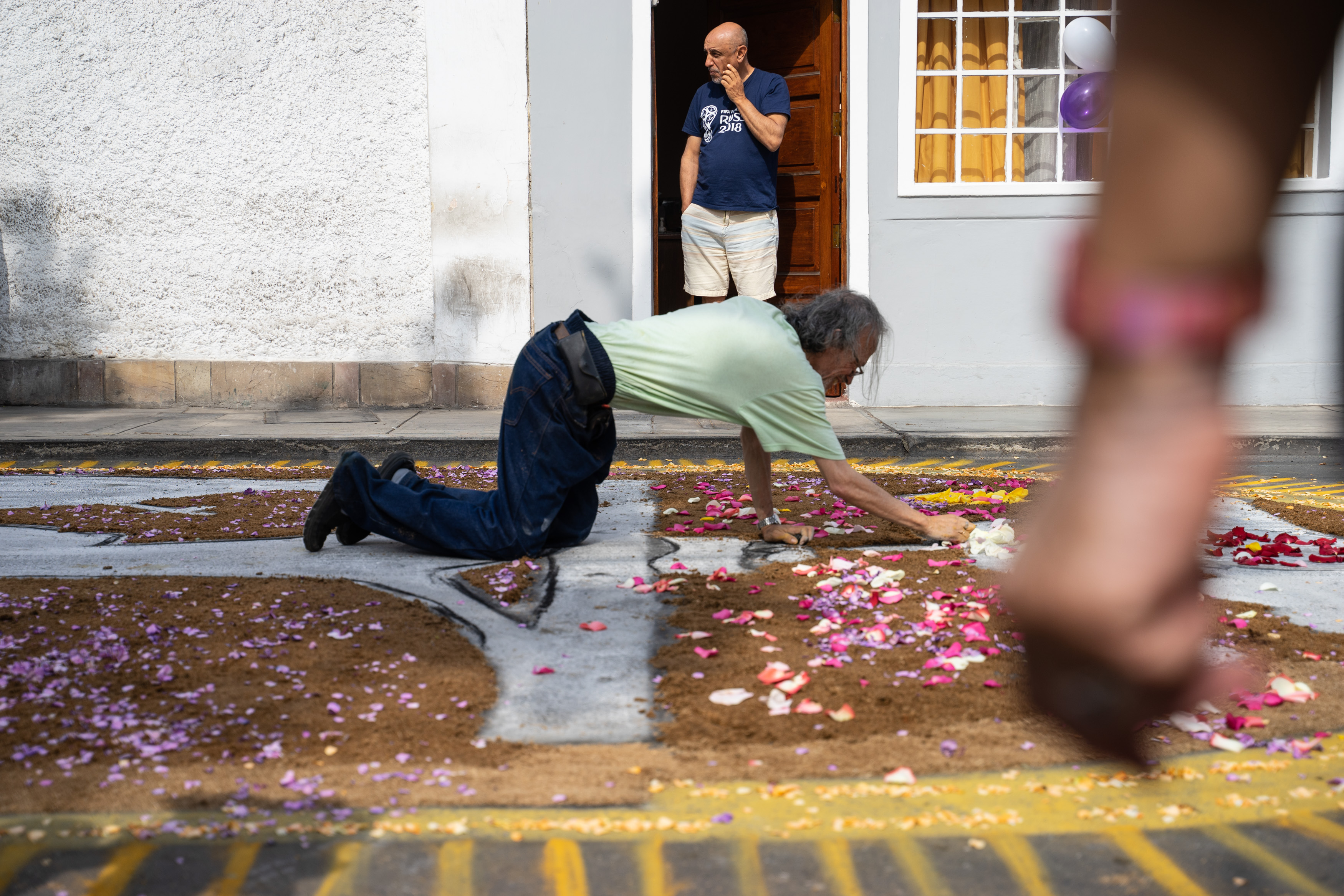 Die Anwohner bringen aufwändige Bilder aus bunter Erde und Blumen auf die Straße auf, die teilweise erst kurz vor der Ankunft fertig sind. Sie bleiben nur kurz heil, bis die Träger der Reliquie drüber laufen.